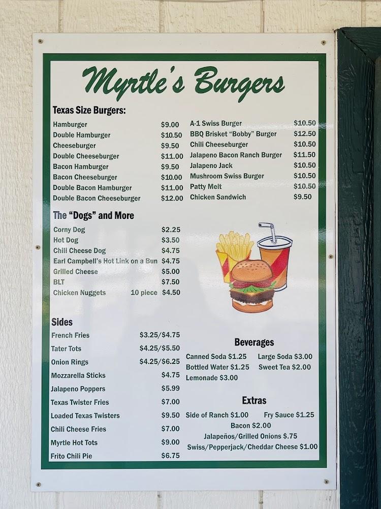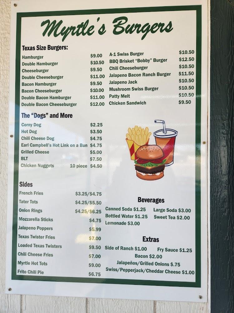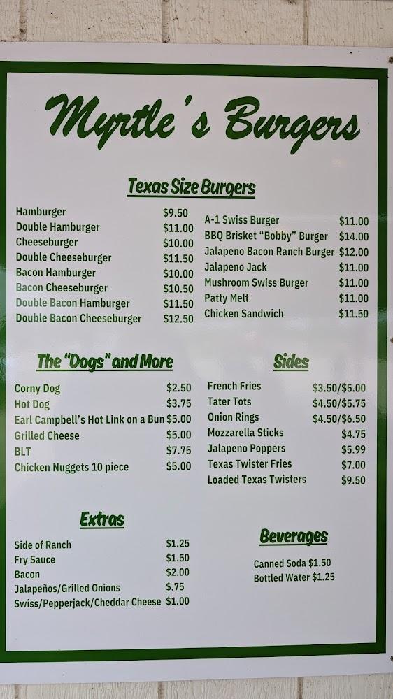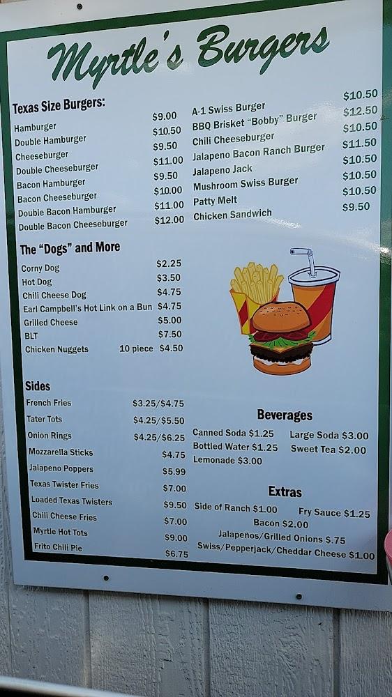 Welcome to Myrtle's Burgers, your go-to destination for delicious fast food in Burleson, TX! Located at 4568 E FM1187 B, we specialize in mouth-watering hamburgers, including our renowned cheeseburgers and crispy onion rings. Enjoy a relaxed atmosphere with both indoor and outdoor seating, and take advantage of our convenient drive-thru and takeout options. Whether you're grabbing lunch, dinner, or a quick bite, our diverse menu also features tasty tater tots and refreshing lemonade, perfect for all ages. Join us today for a satisfying meal in a family-friendly environment!